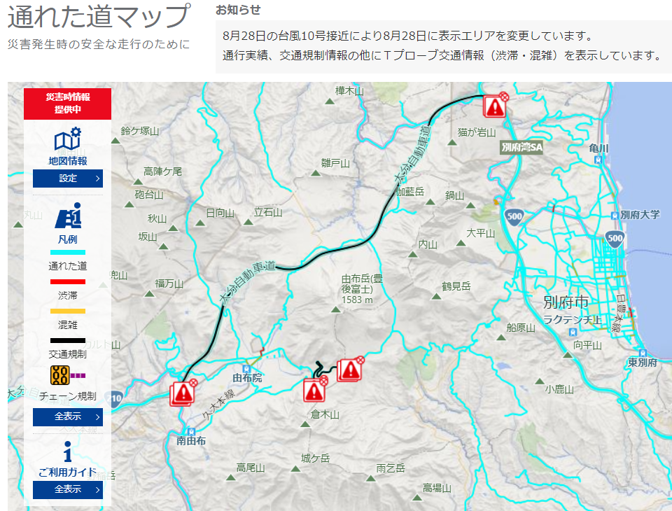 文字ベースの情報、ラジオの情報ではなかなかつかめない道路情報ですが、これを視覚的に教えてくれるのが「通れた道マップ」です。