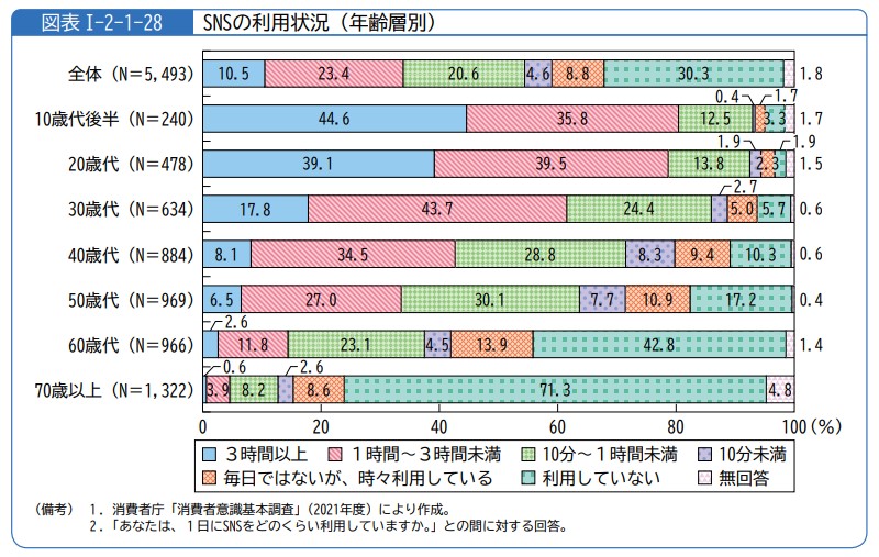 具体的には、2022年現在で20代以下の人の中では、SNSに「1日3時間以上」使うという人も珍しくありません。