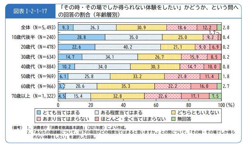 「「その時・その場でしか得られない体験をしたい」かどうか、という問への回答の割合(年齢層別)│令和4年版消費者白書本文」