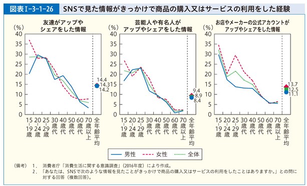 「SNSで見た情報がきっかけで商品の購入又はサービスの利用をした経験│平成29年版消費者白書目次(消費者庁)」