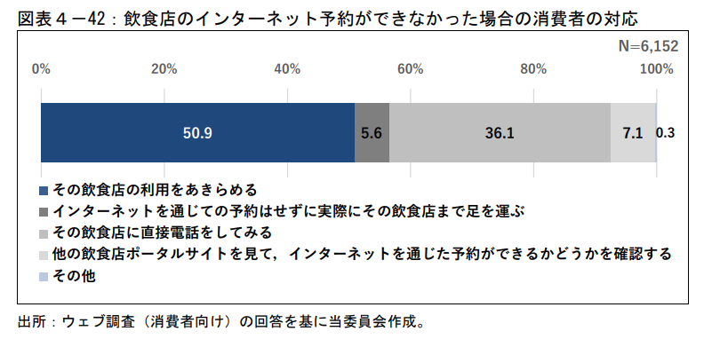 ネット予約できないとわかったなら、「その飲食店の利用をあきらめる(50.9%)」「その飲食店に直接電話をしてみる(36.1%)」の順に多いことがわかっています。