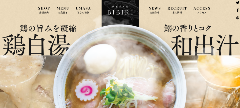 トップページにラーメンの画像があり、背景画を左右に分け「白湯」「出汁」と打ち出すことにより、味をイメージさせることに成功しています。