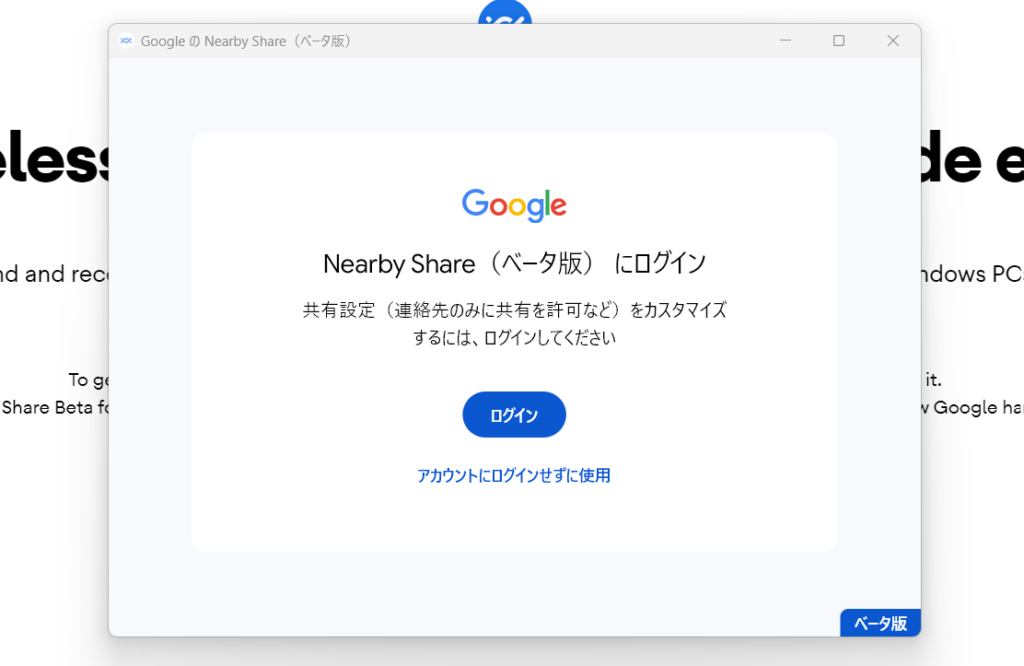 インストール後に「Neareby Share(ベータ版)にログイン」という画面がでますので、ここでは「アカウントにログインせずに使用」を選びます。