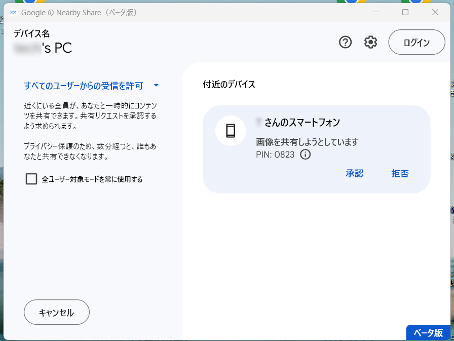 これで、PCのそばにある、Neareby Shareを利用しようとするAndroid端末からのデータ共有を受け入れる準備が整いました。