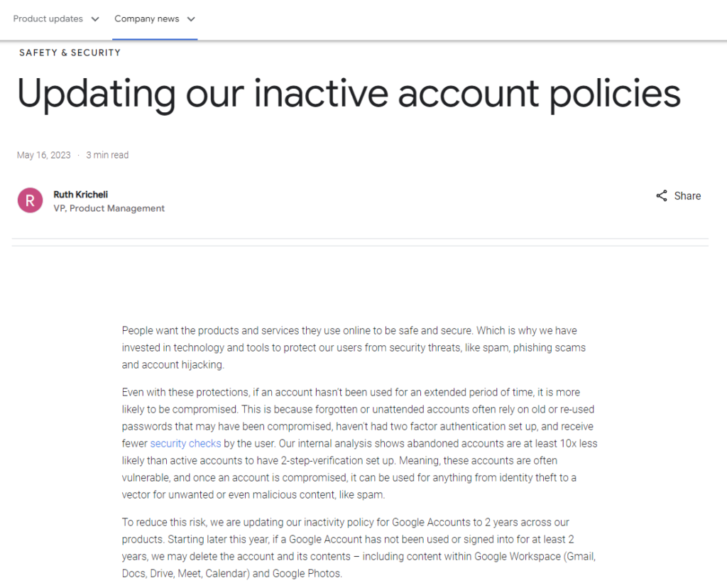 「Updating our inactive account policies│Google The Keyword」