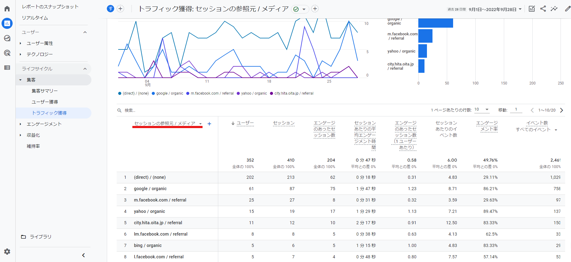 先の「セッションの参照元」に加え、どのように流入してきているのかの情報をチェックできます。
