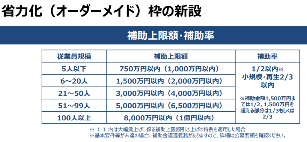 省力化(オーダーメイド)枠においては、最大2,000万円まで補助上限を引き上げる。