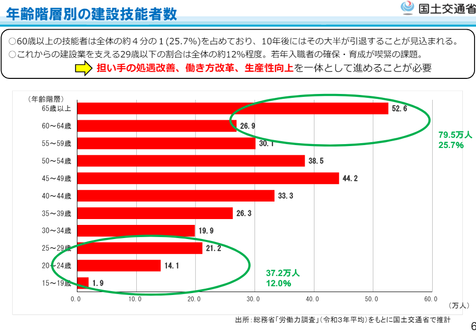 建設業界においては、世の中の「少子高齢化」に似た数字が出ています。