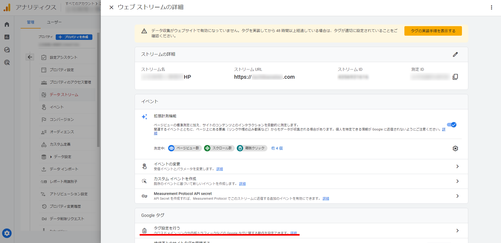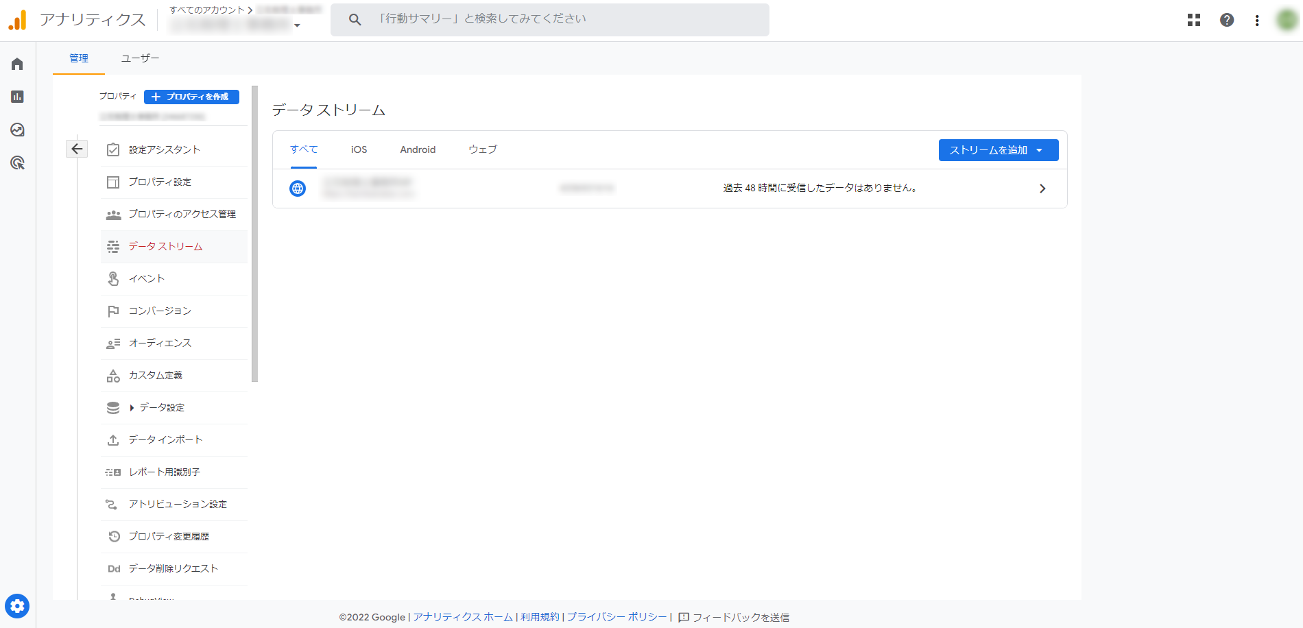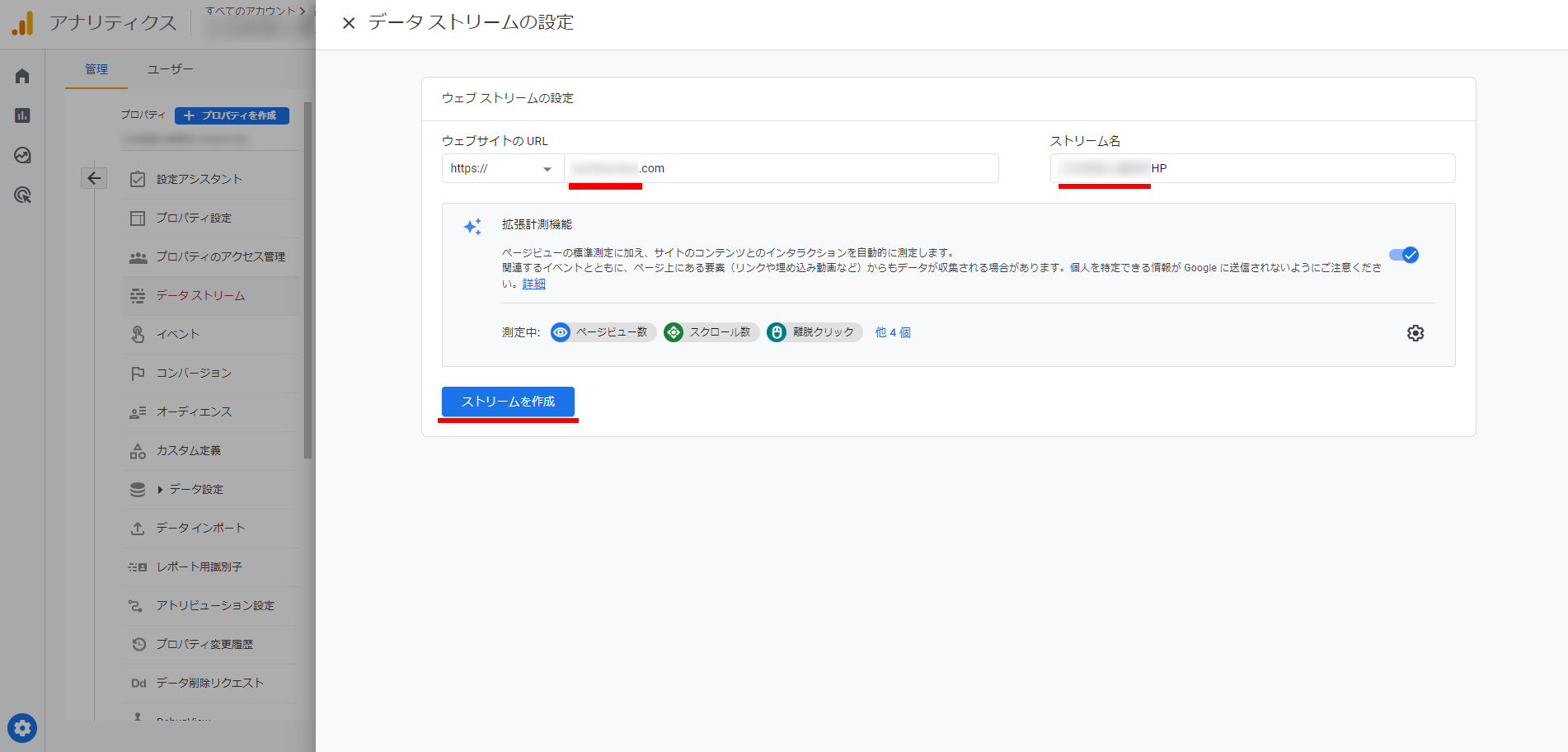 ウェブサイトのURLとストリーム名(任意の文字列。「(会社名)HP」でOK)を入力し、「ストリームを作成」をクリックしてください。