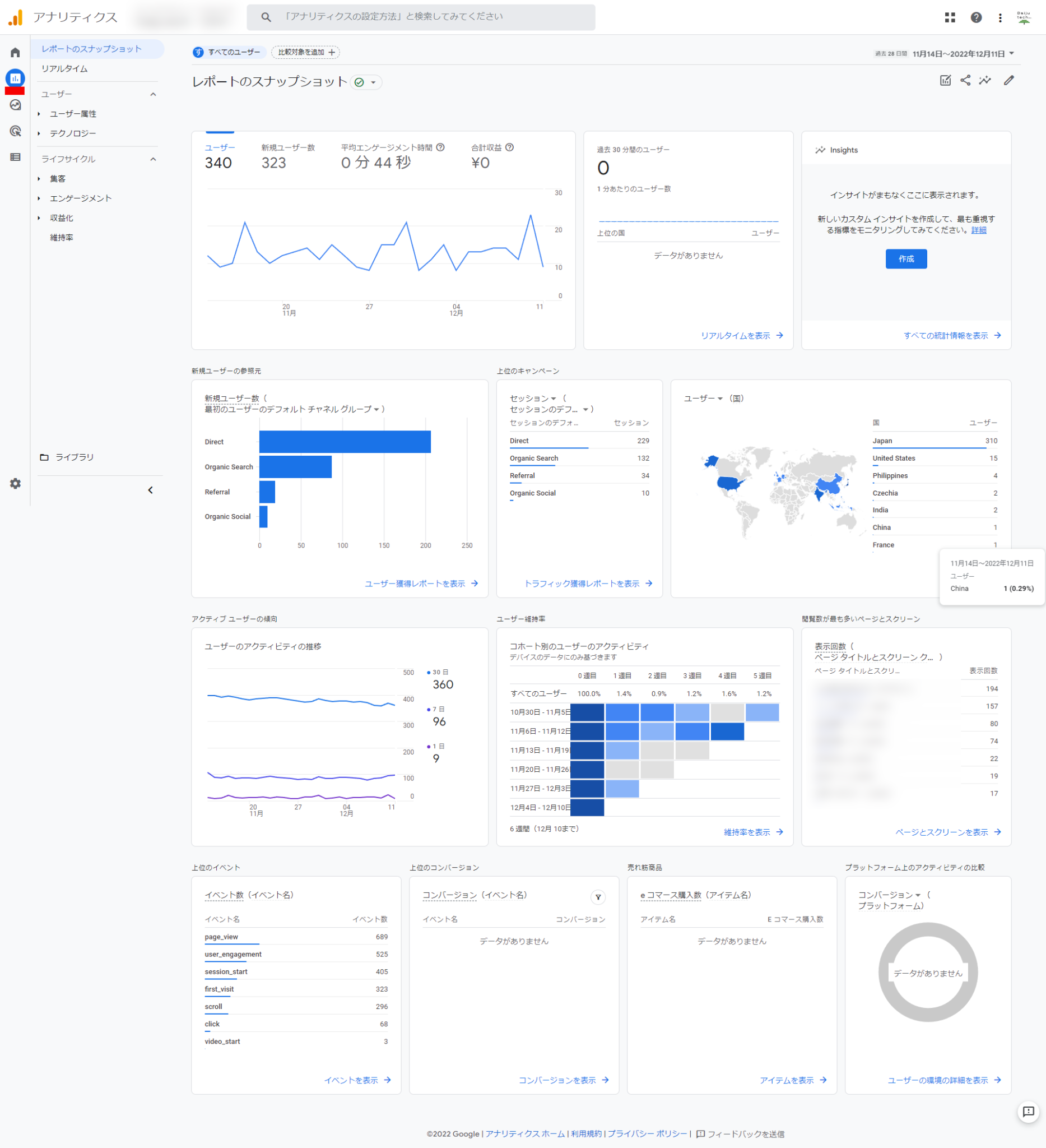 では、GA4では「特別な設定をしない状態」でどんな情報を見ることができるのか、実際の画像を使ってご説明します。