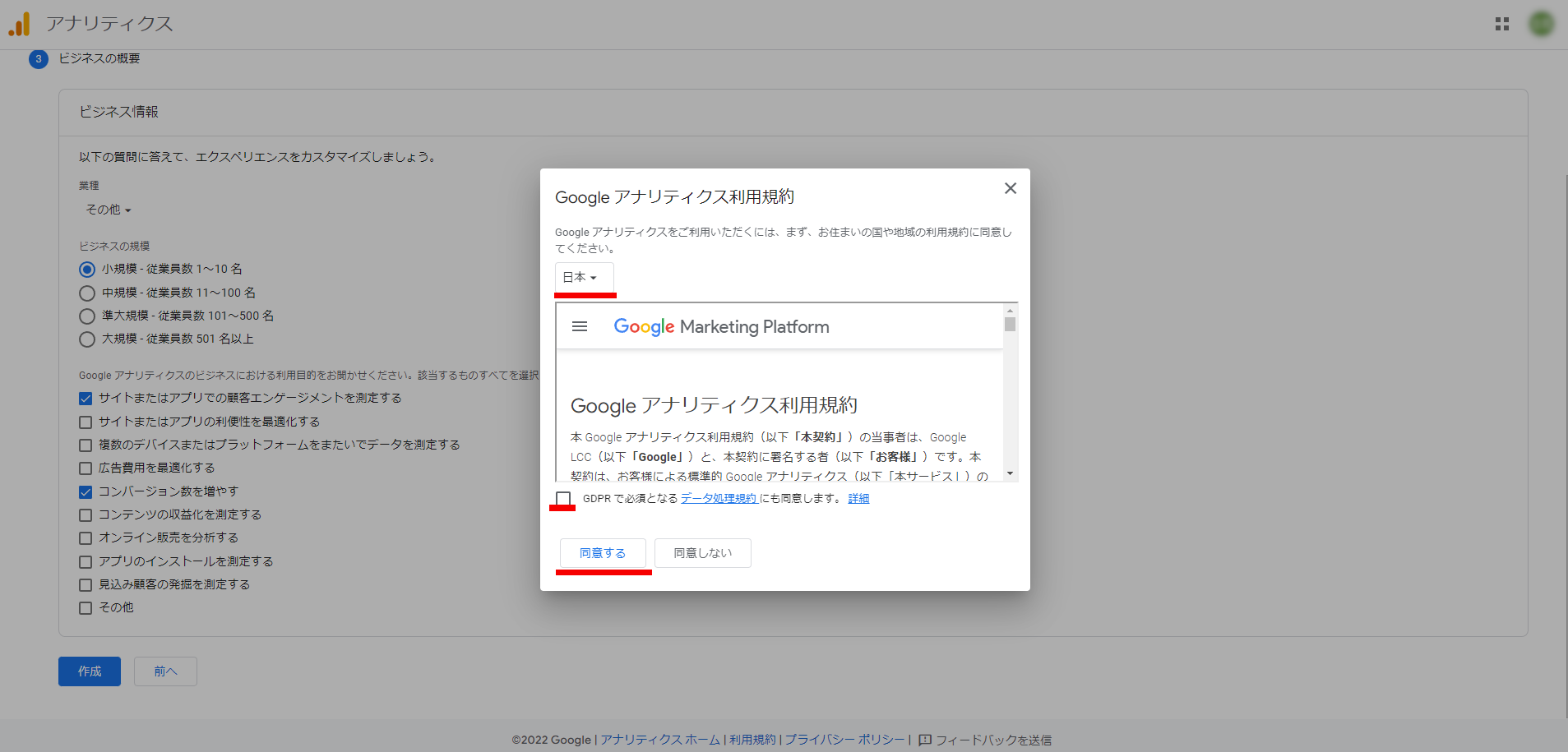 「日本」に切り替え、「GDPRで必須となるデータ処理規約にも同意します」にチェックを入れて「同意する」をクリックしてください。