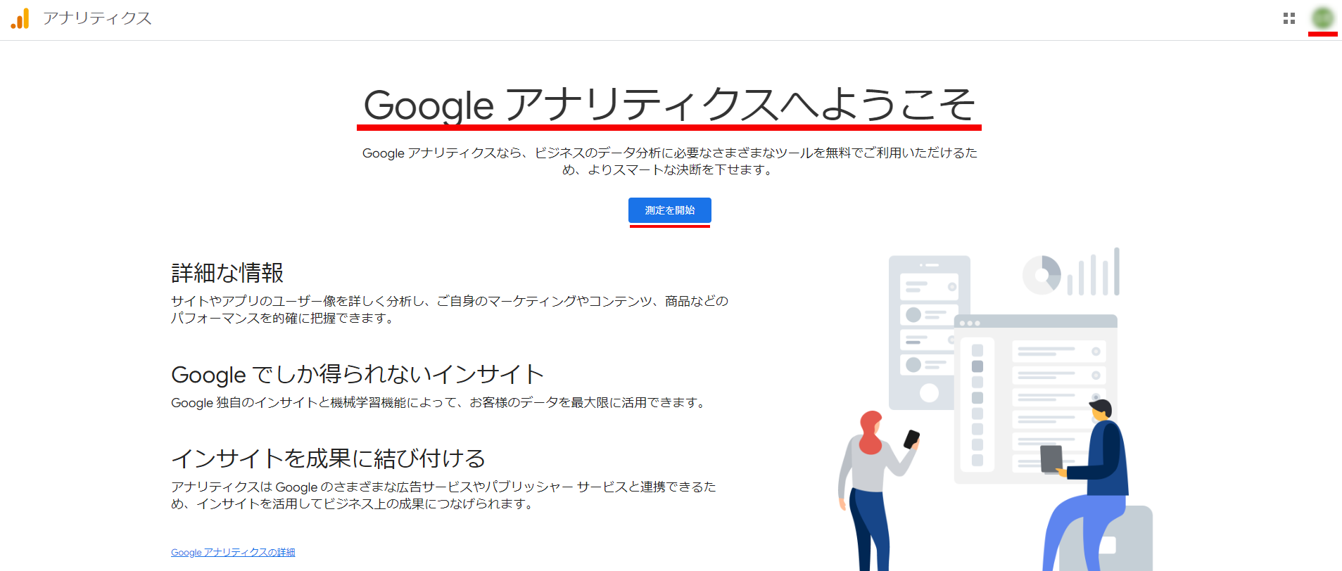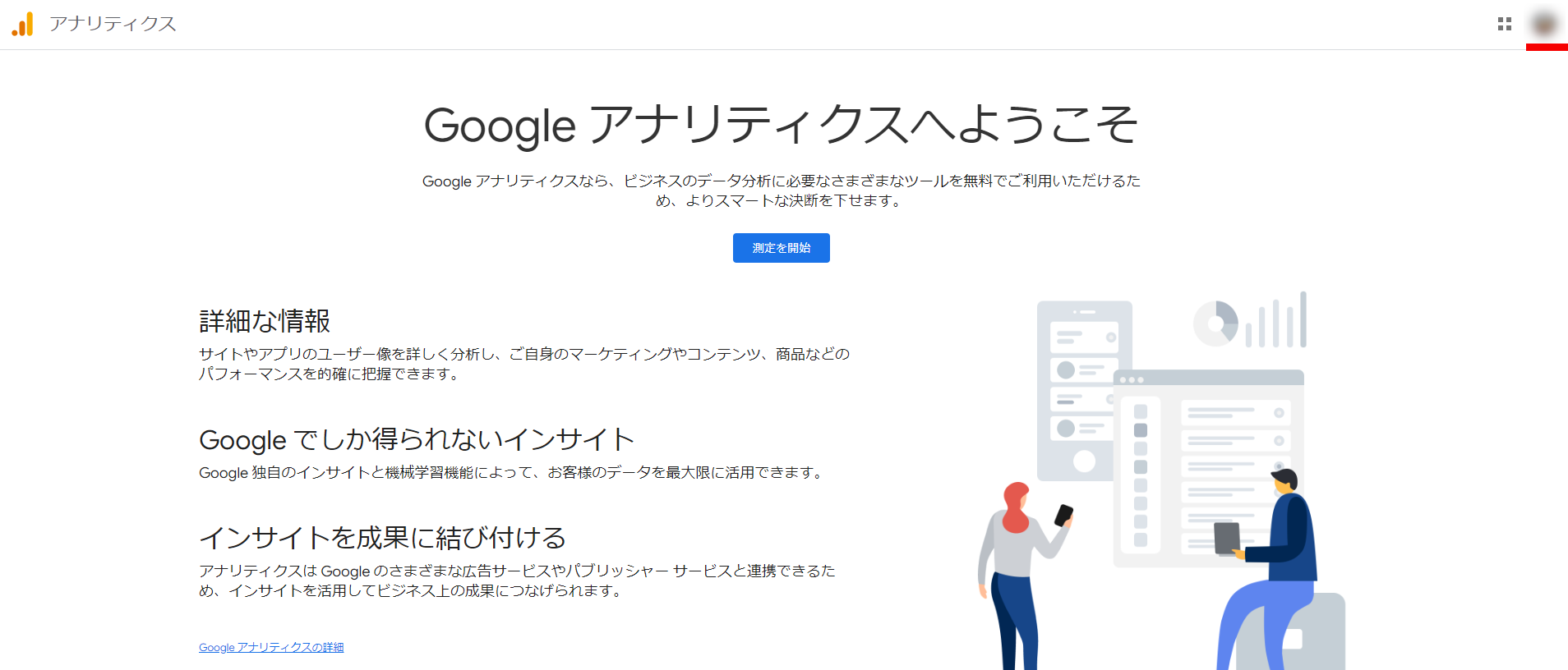 すると、「Googleアナリティクスへようこそ」の画面が現れ、ログインしたIDに対応したアイコンが右上に見えてきます。