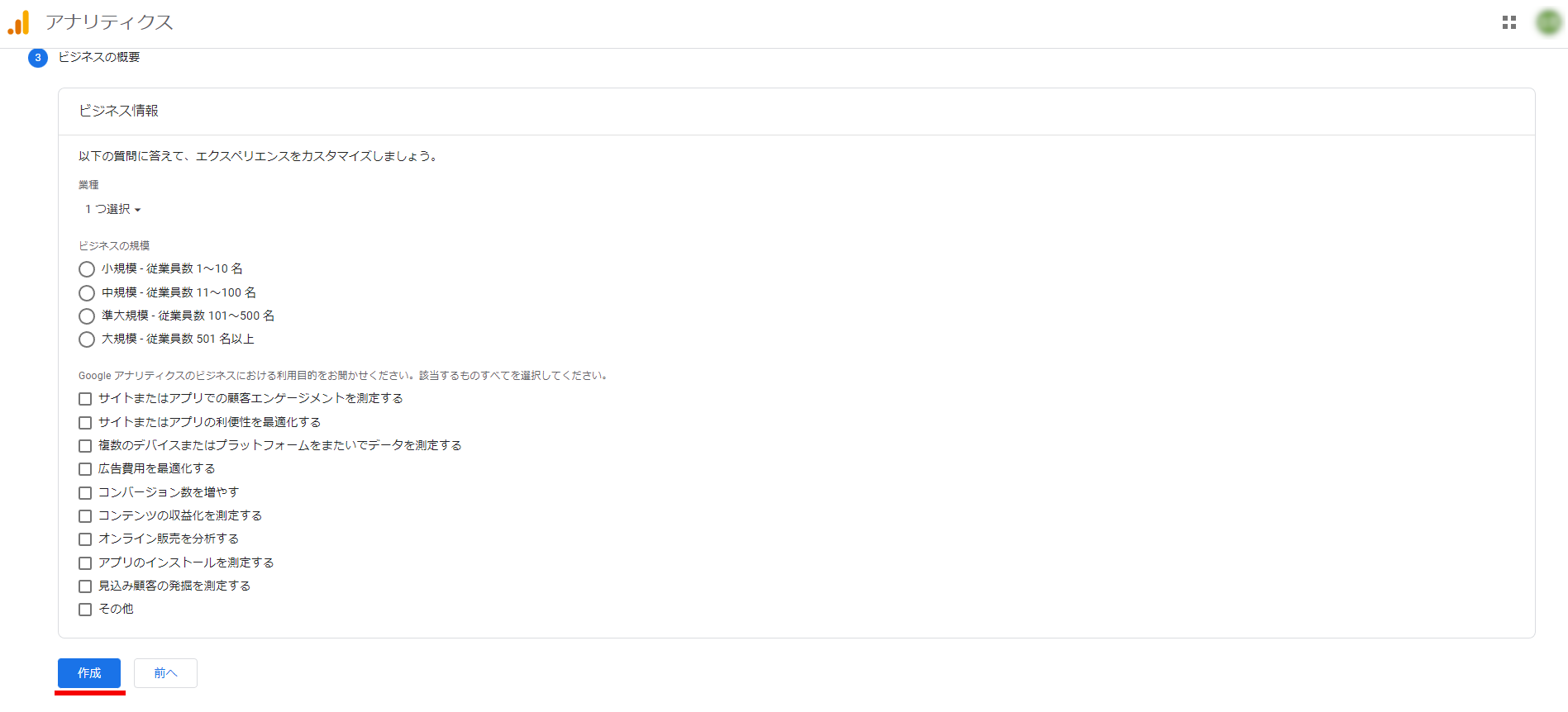 次のページでは、あなたのビジネスに関する事柄をたずねられますので、該当するところにチェックを入れ「作成」をクリックしましょう。