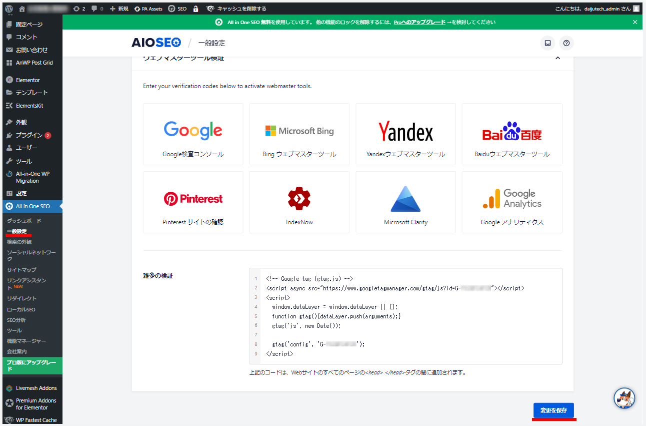 「WordPress」と「All inOne SEO」の組み合わせの場合、「All inOne SEO」の一般設定の中の「雑多の検証」にGA4のタグを貼り付け、「変更を保存」をクリックします。