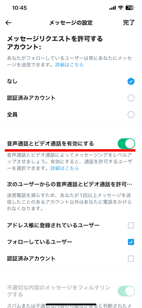 次の画面で、「音声通話とビデオ通話を有効にする」の箇所を見つけてください。
